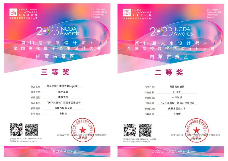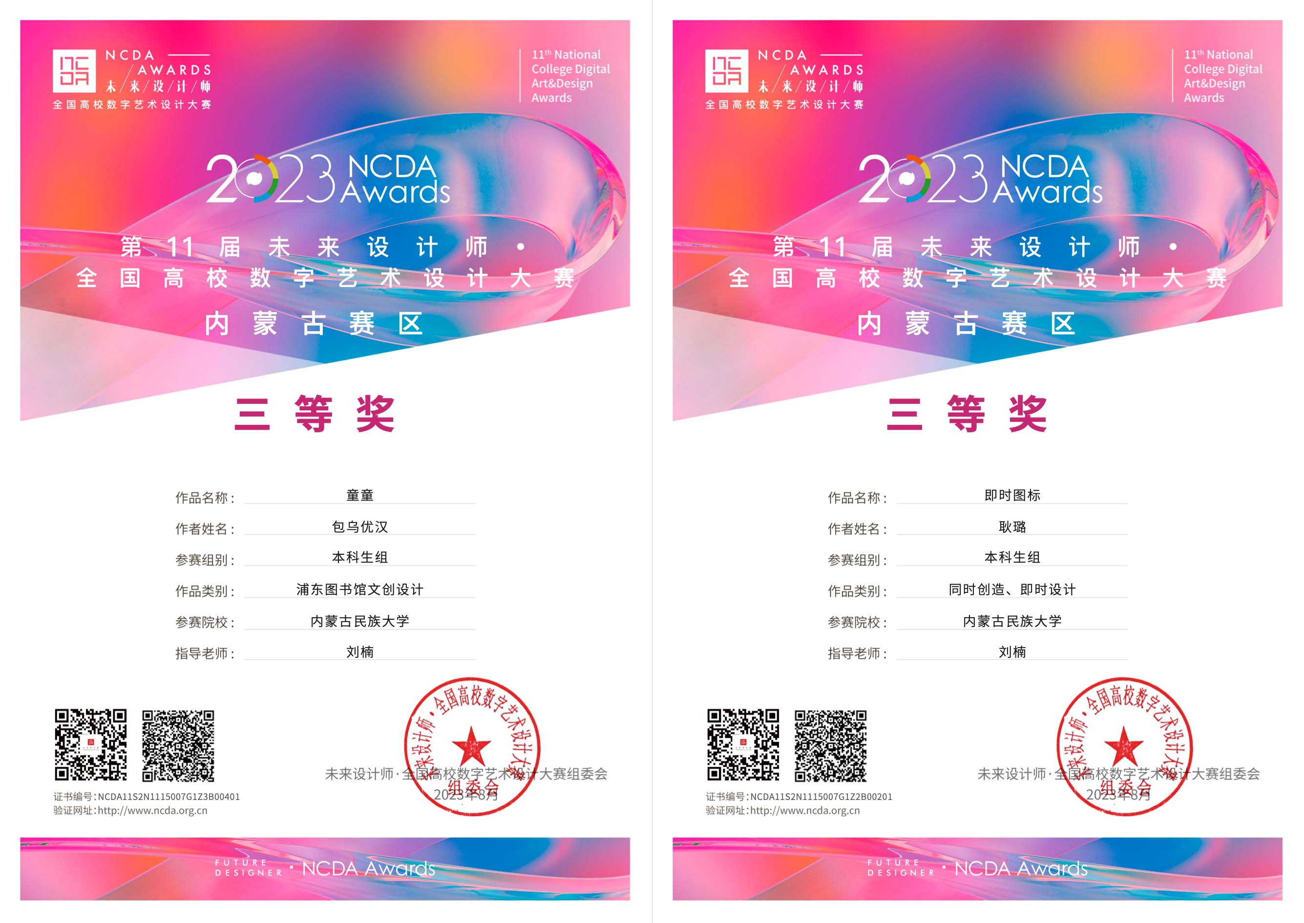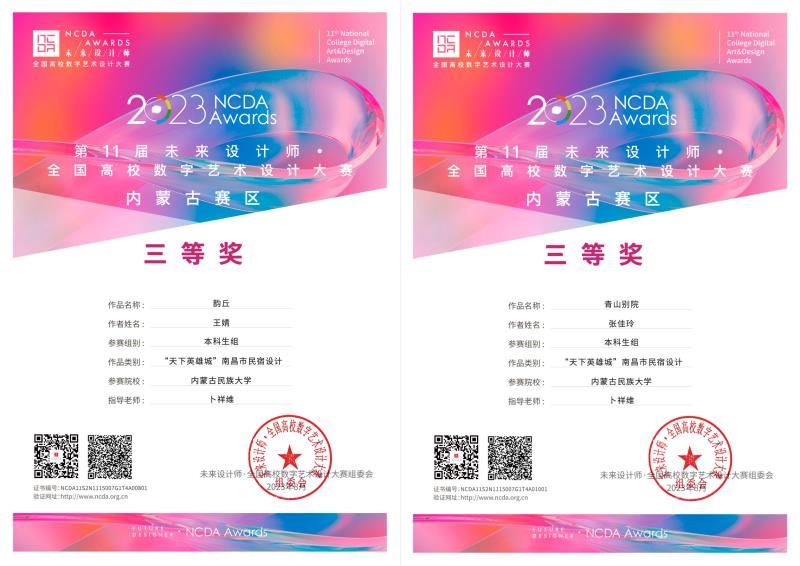 近日,内蒙古民族大学美术学院设计系在“2023年(第16届)中国大学生计算机设计大赛”及“第十一届全国高校艺术设计大赛(未来设计师NCDA大赛)”中取得了优异的成绩。 由教育部高校与计算机相关教指委等联合主办的“2023年(第16届)中国大学生计算机设计大赛”上,我院由数字媒体艺术教师刘楠指导的张诗璨、王昊瑞、王萱获得中国大学生计算机设计大赛省赛三等奖。中国大学生计算机设计大赛是我国高校面向本科生最早的赛事之一,大赛的目的是以赛促学、以赛促教、以赛促创,为国家培养德智体美劳全面发展的创新型、复合型、应用型人才服务。