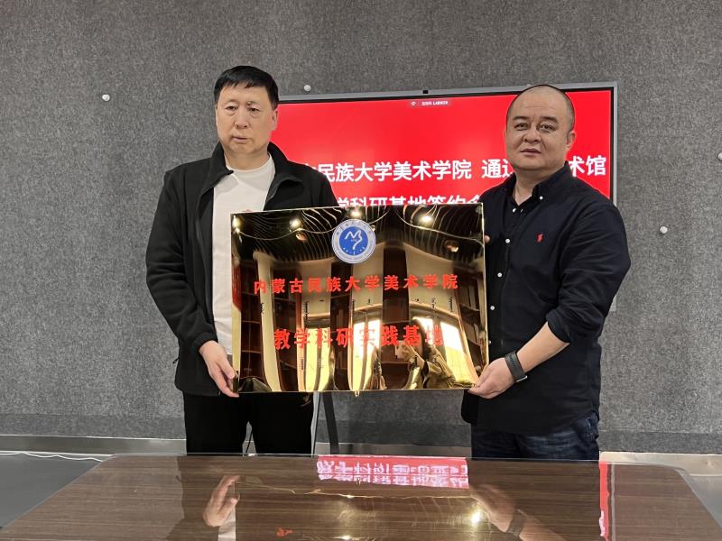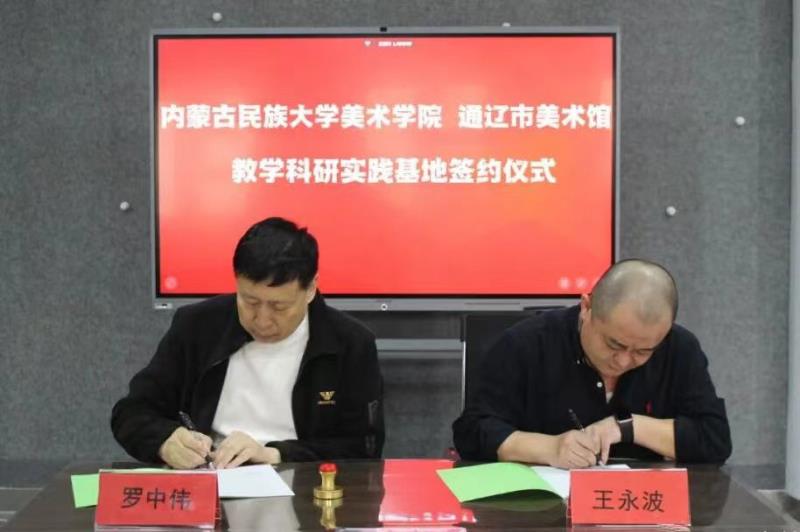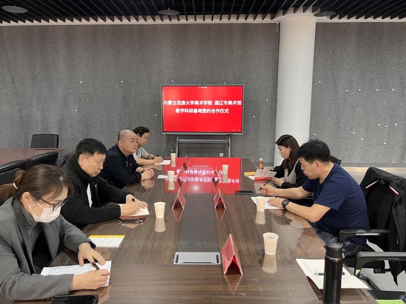 2023年4月10日下午,内蒙古民族大学美术学院与通辽市美术馆举行教学科研实践基地签约合作仪式。美术学院院长王永波、办公室主任长青、美术系教研室主任金宝军及格根萨仁、教学助理温乐洋;通辽市美术馆馆长罗中伟、办公室主任王文婷等参加了仪式。
