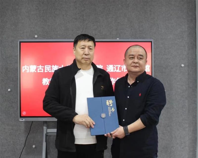 签约仪式上,王永波与罗中伟分别代表内蒙古民族大学美术学院与通辽市美术馆签订了合作协议,共同为“教学科研实践基地”揭牌;王永波代表美术学院向罗中伟馆长颁发了客座教授、研究生校外行业导师聘任证书。
