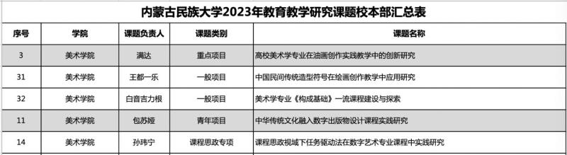 近日,2023年度校级教育教学研究课题立项结果公布,我院教师满达、王都一乐、白音吉力根、包苏娅、孙玮宁在2023年度校级教育教学研究课题立项。课题共立项5项,其中,重点项目1项、一般项目2项、青年项目1项、课程思政专项项目1项。