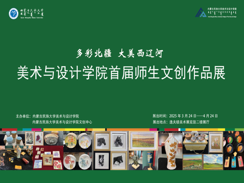 近日,“多彩北疆 大美西辽河——内蒙古民族大学美术与设计学院首届师生文创作品展”在西拉木伦校区逸夫楼美术展览馆二楼展厅正式拉开帷幕。