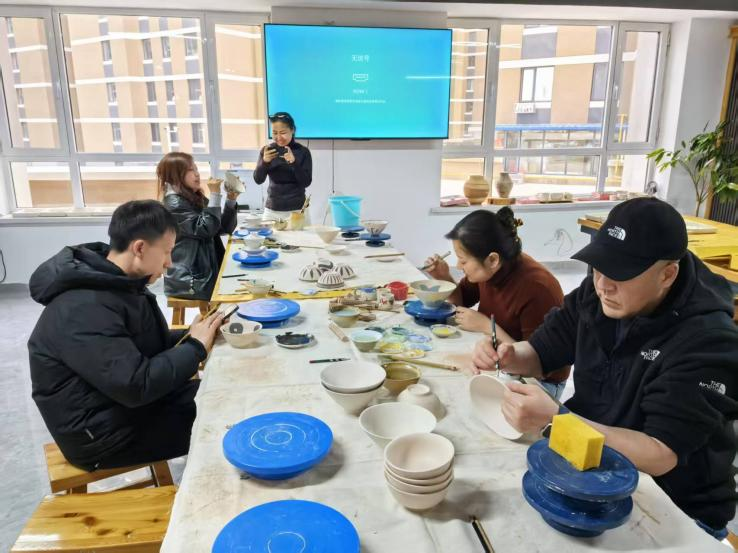 在活动过程中,教研室成员深入学习了陶瓷拉坯技艺,体验手工成型的独特魅力,并结合内蒙古地域文化特色,在陶坯上进行创意绘制。大家以草原文化、图腾图案、传统纹样等元素为灵感,通过笔触与色彩表达对地域文化的理解与创意。通过实践,不仅提升了教师们对陶艺工艺的认知,也进一步探讨了陶瓷艺术在视觉传达设计中的应用的实践路径。